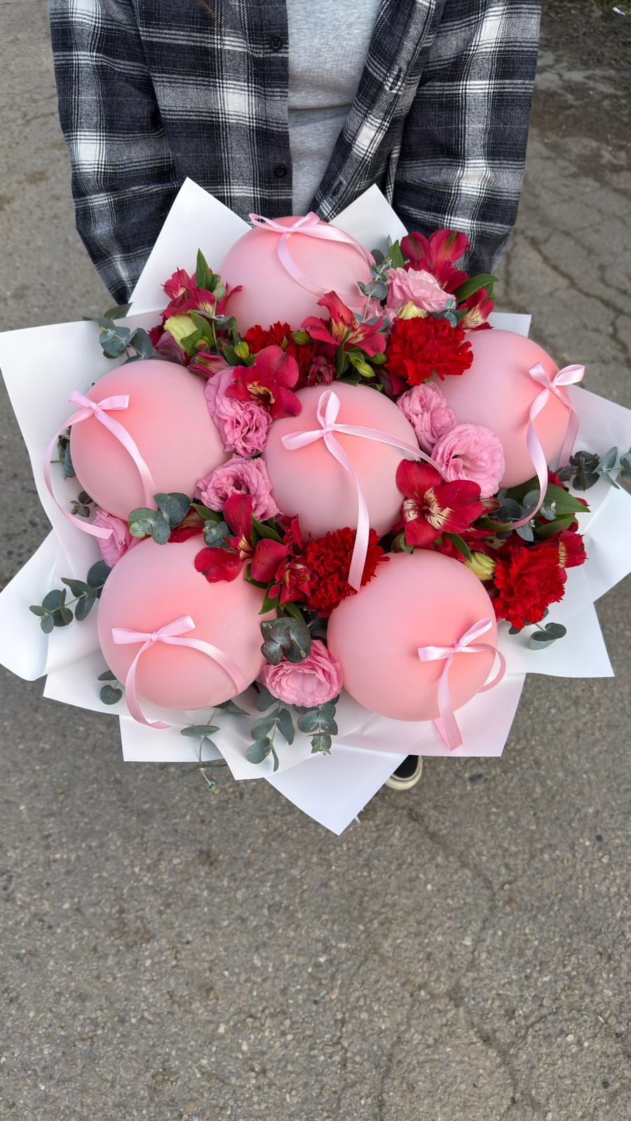 זר המורכב מבלונים ורודים עם פפיונים ורודים בשילוב פרחי העונה בגווני אדום וורוד