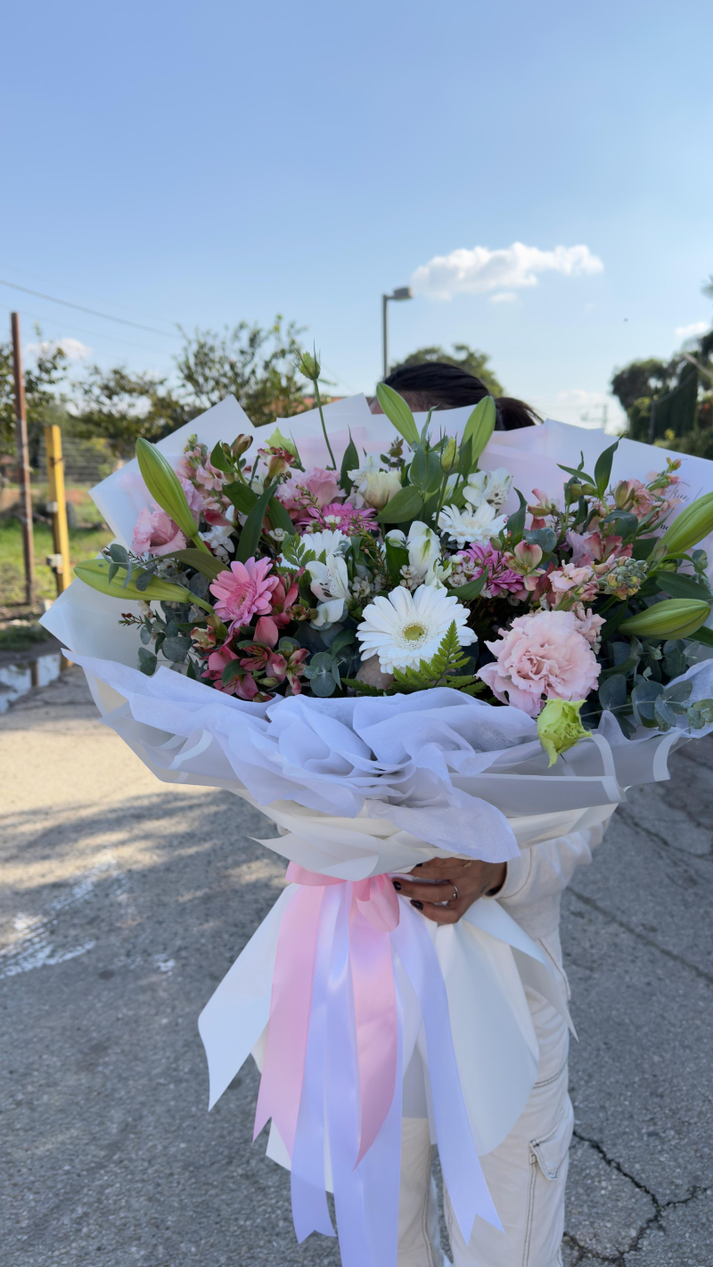 זר פרחים בגווני ורוד ולבן בשילוב פרחי העונה