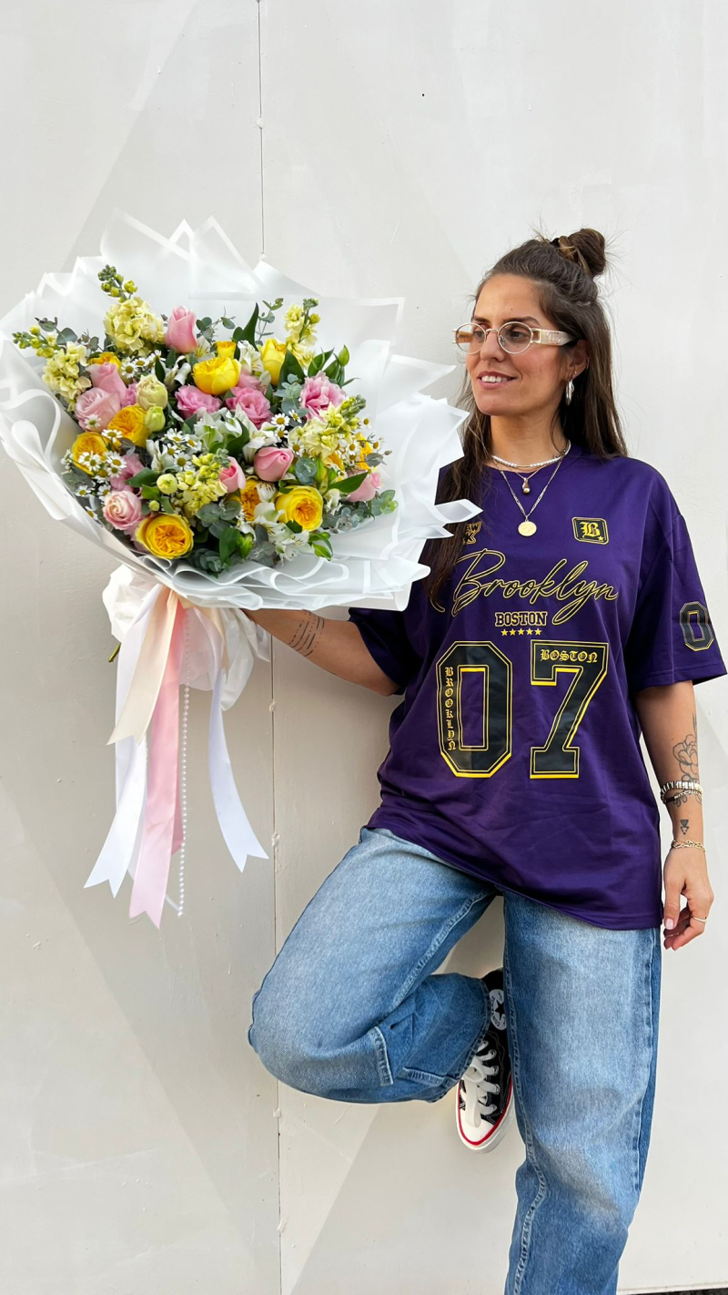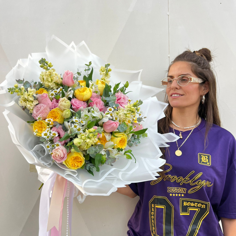 זר צפוף, יוקרתי ומיוחד המורכב מפרחי העונה בשילוב ורדים בגווני ואוד לבן וצהוב הפרחים משתנים בהתאם למלאי הקיים ולעונה ולכן התמונה להמחשה בלבד