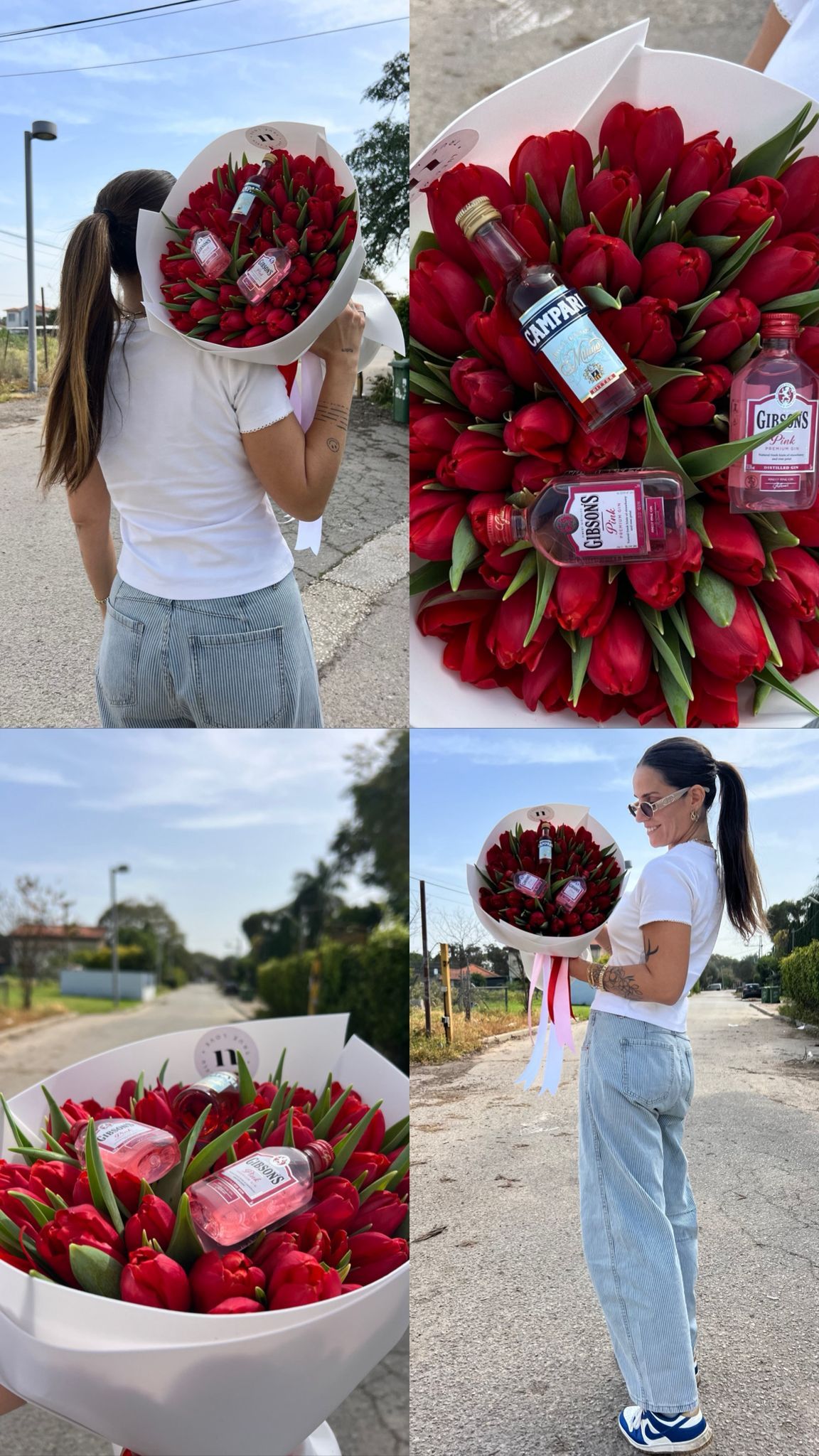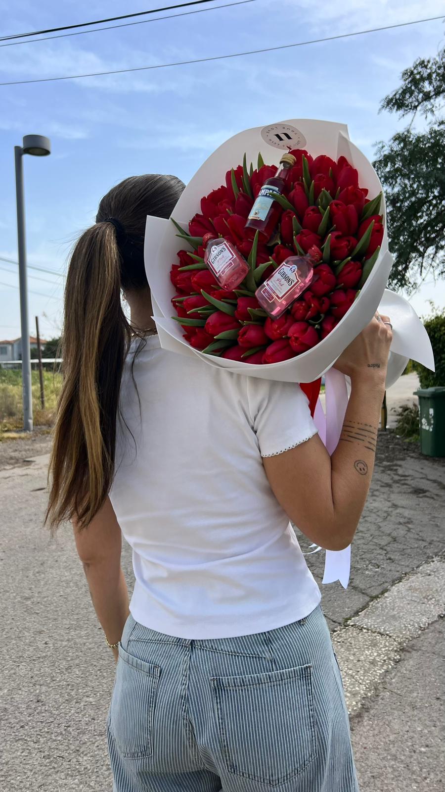 זר המורכב מטוליפים בשילוב בקבוקי אלכוהול מיניאטורים